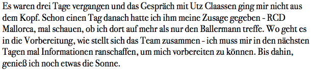 Eine lange Nacht war vergangen - RCD Mallorca konnte sich am letzten Spieltag gerade noch so retten und den Abstieg in die dritte spanische Liga verhindern. Uta Claassen, seinerseits deutscher Präsident bei den Los Bermellones, war überhaupt nicht zufrieden mit der Saisonleistung seiner Mannschaft. Zu Beginn wurde man als Aufstiegskandidat betitelt - die Rückkehr in die erste Liga war schon sicher, so die Boulevardzeitschriften. Man wurde letztendlich eines besseren belehrt. Für Claassen hieß es jetzt sich auf die Saison 14/15 vorzubereiten und einen Nachfolger für den glücklosen Albert Ferrer zu finden, der noch in jener erwähnten Nacht entlassen wurde. Ziel war ein Trainer, der selbst schon viel Erfahrung über den spanischen Fußball, das Land und die Sprache gesammelt hat.