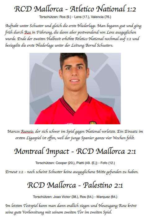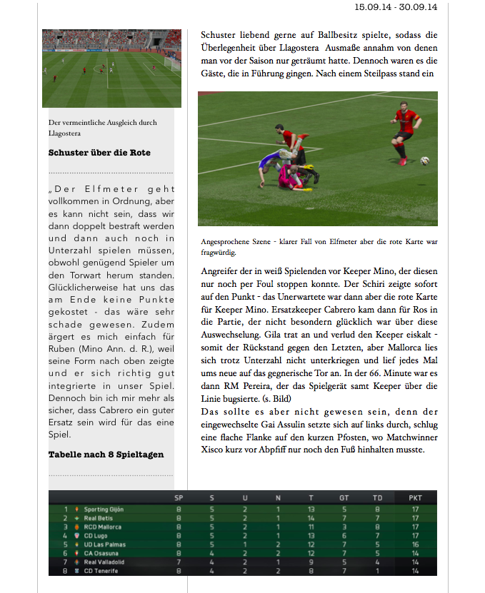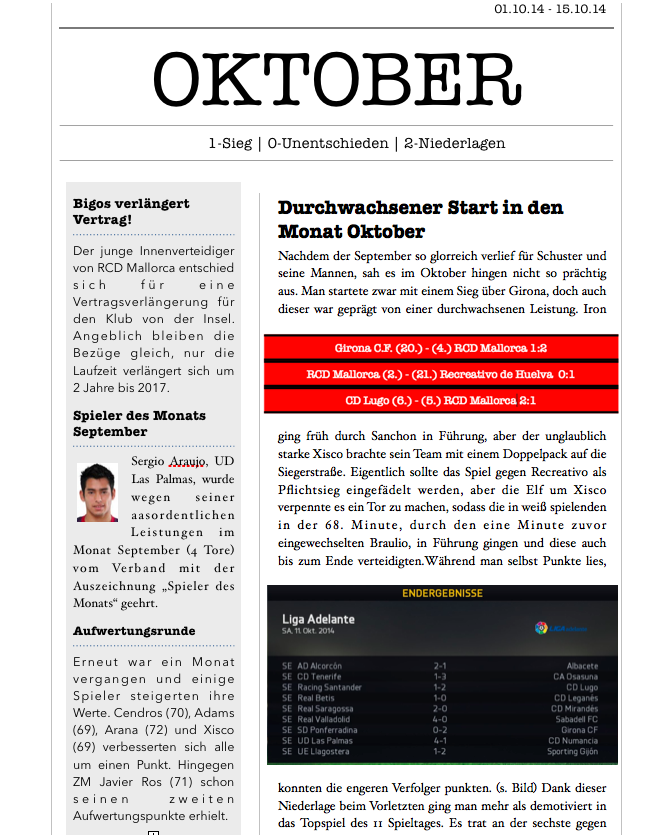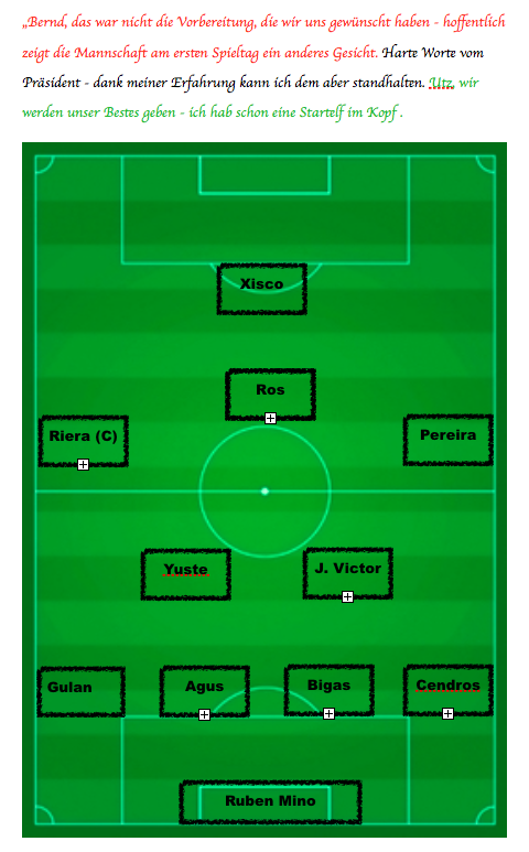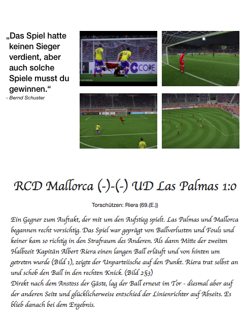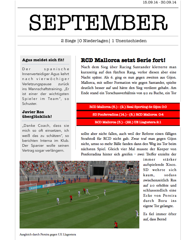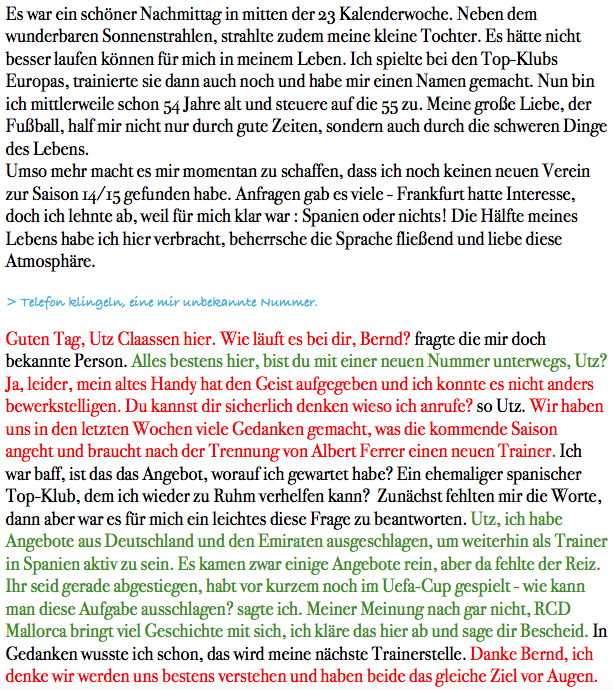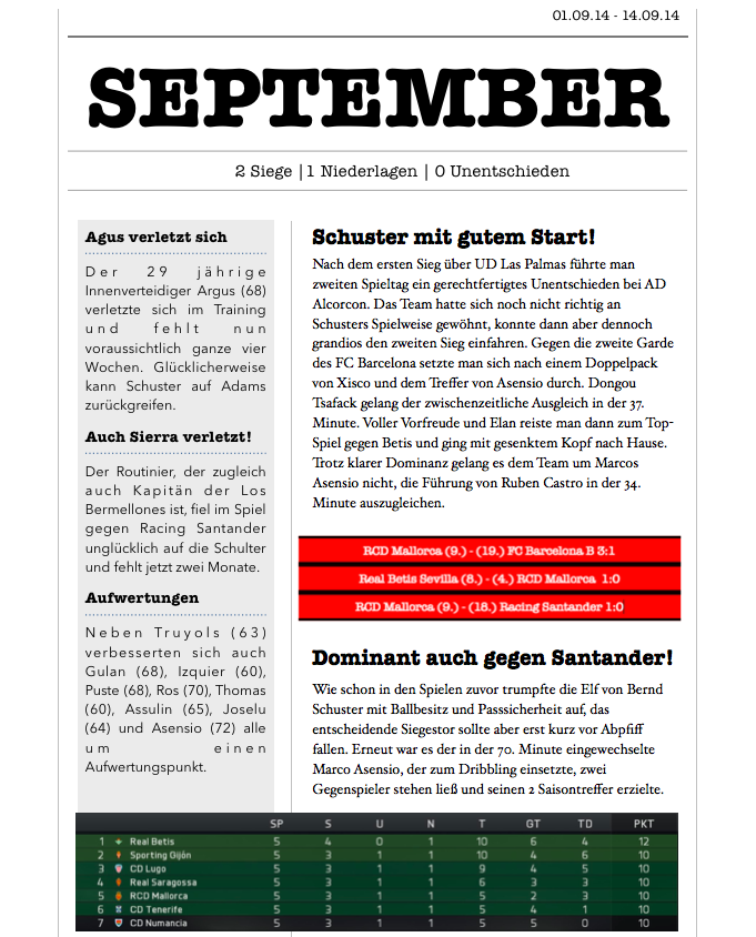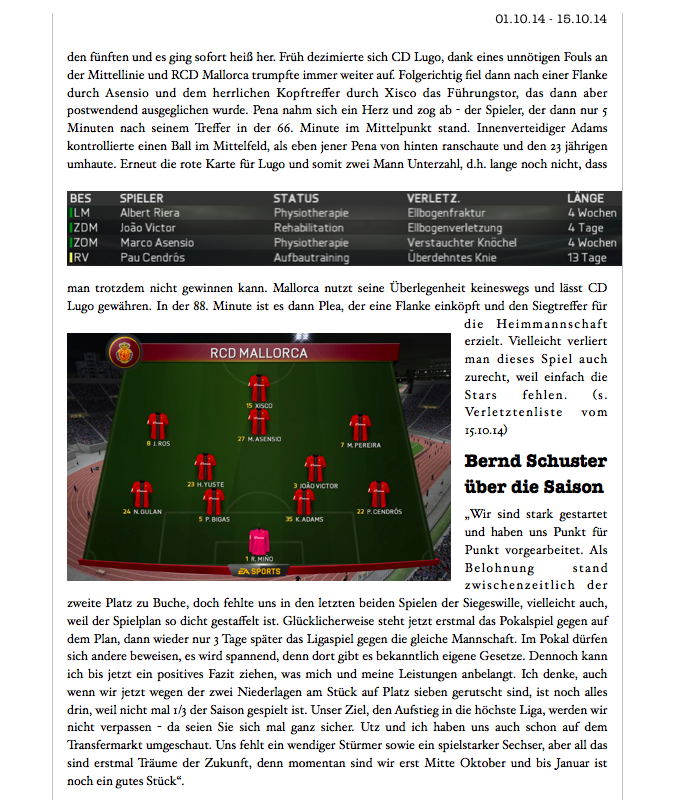 Grüß dich, Bernd. Ich rufe an, weil mir soeben der Spielplan für die neue Saison zugesandt wurde. Wir starten am ersten Spieltag gegen Las Palmas im Iberostar Estadi, danach geht es auswärts gegen AD Alcorcon. Das erste Spiel wird für uns alle entscheidend sein, die Fans feiern dich jetzt schon und rechnen mit einem Sieg, nicht weniger. So auch ich. Hohe Erwartungen waren an mich geknüpft, hoffentlich enttäusche ich keinen. Ach, vielen Dank für die Info - habe mich gerade sowieso mit der Formation zur neuen Saison auseinander gesetzt. Ich erzähle dir demnächst mehr, jetzt erstmal das Training vorbereiten.