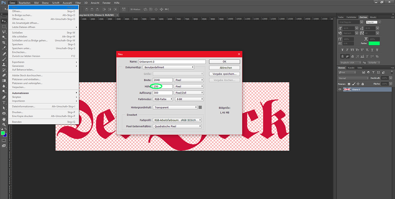 Wir erstellen nun eine neue Grafik mit den Maßen 2048 x 250:
