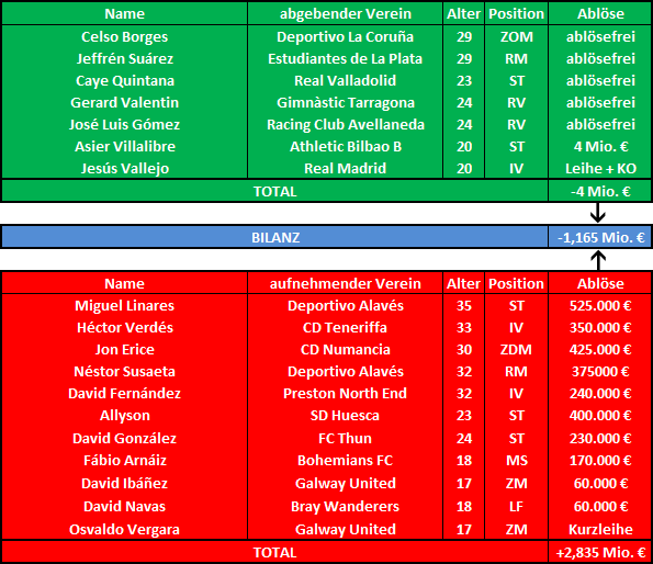 David Fernández: War letztes Halbjahr an Alavés verliehen, konnte dort aber auch kaum Einsatzzeit verbuchen. Bei Oviedo so gut wie ohne Chancen auf Einsatz, Wechsel scheint nahezu unausweichlich. Rolle: Reservespieler, Wechselwahrscheinlichkeit: 90%