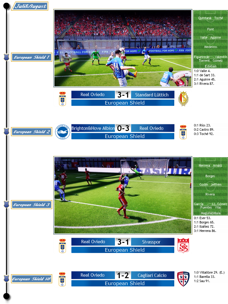 Real Oviedo entschied sich dieses Jahr erneut für das Vorbereitungsturnier in Italien, im San Siro Stadion bekam man es in der Gruppe mit Sivasspor, Standard Lüttich und Brighton & Hove Albion zu tun. Keine einfache Gruppe, doch für Sergio Egea die Chance, seinen jungen Spielern genau auf die Beine zu schauen. Im ersten Spiel gegen Standard Lüttich durfte noch die etatmäßige Einsergarnitur ran, Borges nahm vorerst auf der Bank Platz und in der Innenverteidigung bekam Kike Torrent eine Chance. Oviedo startete blitzartig und ging mit der ersten Chance im Spiel durch Borja Valle in der 4. Minute in Führung. Danach zeigte aber auch Standard, dass man international einen beachtlichen Ruf hatte, drückte stark auf den Ausgleich, welchen letztendlich de Sart in der 33. Minute besorgte. Kurz vor der Pause sah die Abwehr der Belgier bei einem Solo von Aguirre aber alles andere als glücklich aus, zusätzlich wurde der Schuss noch unglücklich abgefälscht. Mit der knappen Führung im Rücken ließ Oviedo die Belgier im zweiten Durchgang kommen und setzte auf Konter, diese brachten jedoch mäßigen Erfolg. In der Schlussphase köpfte aber der eingewechselte Rivera nach einer Ecke das 3:1 und machte den Deckel drauf.