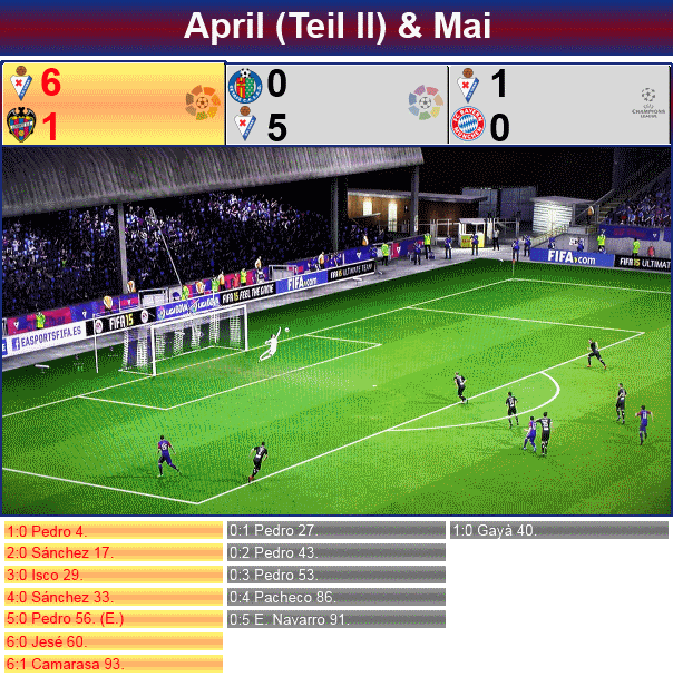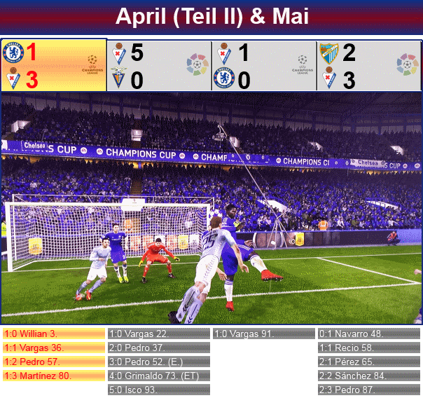 4 Spiele standen im April noch an, zwei davon in der Liga und zwei in der Champions League, das Halbfinale gegen Chelsea. Gegen die Engländer ging es auch gleich als erstes. An der Stamford Bridge begann für die sofort stark andrückende Elf von José Mourinho alles nach Plan, nach nur 3 Minuten traf Willian nach Superpass von Eden Hazard zur frühen 1:0 Führung. Eibar brauchte eine Zeit, um den Schock zu verdauen, übernahm aber ab der 30. Minute immer mehr das Kommando. Chelsea blieb nur noch passiv und bekam prompt die Rechnung präsentiert, Vargas verwertete einen Lochpass von Alonso zum Ausgleich. Nach dem Wechsel wurde Eibar immer stärker, die Engländer verlagerten ihr Spiel, trotz eines 1:1, was keine sonderlich gute Ausgangsposition wäre, immer mehr nach hinten und wurde dafür bestraft. Superstürmer Pedro traf in der 57. Minute nach einem Eckball von Jesé per Kopf, dabei sah Courtois aber nicht gut aus, der Belgier kam raus, erwischte den Ball aber nicht. In der 80. Minute fast eine Kopie davon, diesmal Ecke von Pedro, Iñigo Martínez kam wuchtig angerauscht und köpfte den Ball zum 1:3 ins Tor.