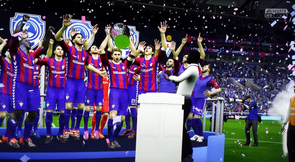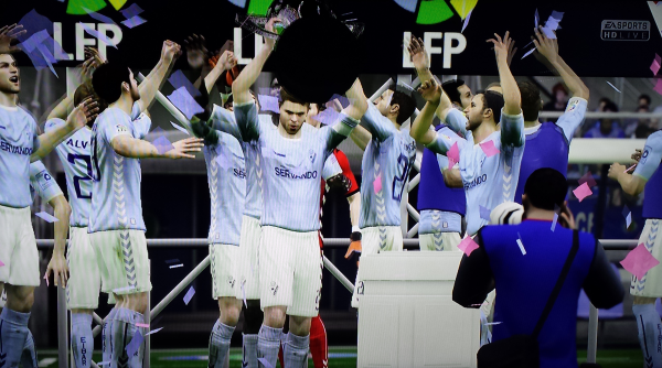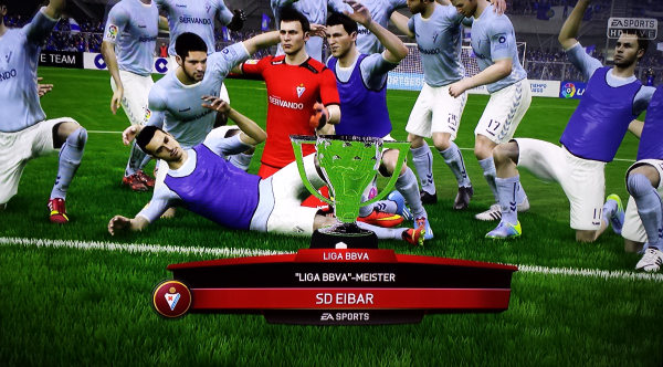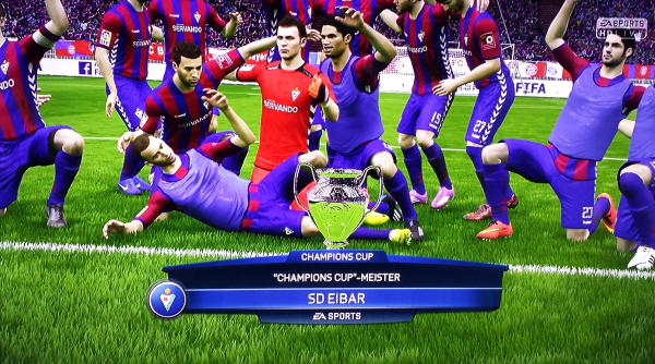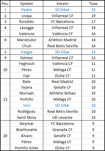 Und da gab es nicht nur vorne, sondern auch hinten Spannung. Während Villarreal gegen Abstiegskandidat Espanyol auf einen Umfaller von Eibar bei Getafe hoffen musste, kämpften mit Espanyol Barcelona, Real Sociedad und dem FC Badalona gleich drei Teams ums blanke Überleben, alle drei hatten 30 Punkte und nur einer aus diesem Trio würde sich auf Platz 17 retten können, es würde also erstmals einen größeren Klub erwischen. Die besten Karten hatte dabei Real Sociedad, die zuhause gegen Elche spielten, Badalona musste bei València ran. Schon früh ging Villarreal in Führung, erhöhte den Druck auf Eibar, die aber auch nicht lange auf sich warten ließen. Pedro ließ mit einem Hattrick keine Zweifel aufkommen und stellte die Weichen Richtung Meisterschaft. Auch bei Villarreal bekam man den Zwischenstand mit, man glaubte nicht mehr an diese Minichance. Während Eibar sein Spiel ohne Zweifel und verdient mit 0:5 gewinnen konnte, schaffte Espanyol in der Schlussphase noch den sensationellen Auslgeich bei Villarreal und hielt die Klasse. Badalona musste sich València denkbar knapp geschlagen geben und stieg direkt wieder ab, die größte negative Überraschung war aber der Abstieg von Real Sociedad. 2013/14 noch in der Champions League unterlagen die Basken zuhause Elche mit 0:2 und stiegen damit in die Liga Adelante ab. Entsetzen auch in Eibar, keiner wollte es wahrhaben! Vorne zogen Eibar und Villarreal einsam seine Kreise, mit unglaublichen 94 Punkten reichte es für das gelbe U-Boot nur zum Vizemeistertitel, doch man darf sich mit der Champions League trösten. Einen weiteren Rekord erzielten die beiden einsamen Spitzenreiter auch, sowohl Eibar, als auch Villarreal blieben eine ganze Saison lang ohne Niederlage! Weiters konnten sich die beiden Madrider Klubs die CL sichern, Real muss durch die Quali, Málaga schaute durch die Finger und spielt nur in der Europa League, so wie auch València und der FC Barcelona, der es nur auf Rang 7 brachte, aber aufgrund der Pokalkonstellation auch als 7. EL spielen darf. Eine Seuchensaison beendete der FC Sevilla, mit dem Abstieg hatte man am Ende zwar nichts mehr zu tun, aber Rang 13 war deutlich zu wenig, sodass Trainer Fernando Navarro seinen Stuhl räumen musste. Auch bei Barcelona werden nach Platz 7 Rufe nach dem Abgang von Luis Enrique laut. Ronaldo scheint es jedenfalls zu reichen, er verlässt Barca in Richtung Eibar, um Champions League spielen zu können!