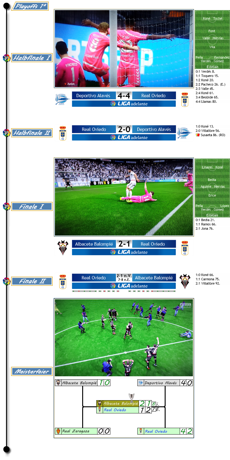 Bitter für Real Oviedo, beinahe hätte man den Durchmarsch a la Eibar, Metz, Darmstadt oder GFC Ajaccio geschafft, wurde aber am letzten Spieltag noch von Real Valladolid abgefangen und muss nun durch die Playoffs. Dort will man es besser machen als Girona letztes Jahr (Anm.: 0:3, 4:0 gegen Zaragoza im Halbfinale). Im Halbfinale treffen die Asturier dabei brisanterweise auf Deportivo Alavés, die man erst vor wenigen Wochen mit 6:0 abgeschlachtet hatte, die Basken wurden Sechster. Im anderen Spiel duellieren sich Albacete Balompié und Real Zaragoza um den Einzug ins Finale.