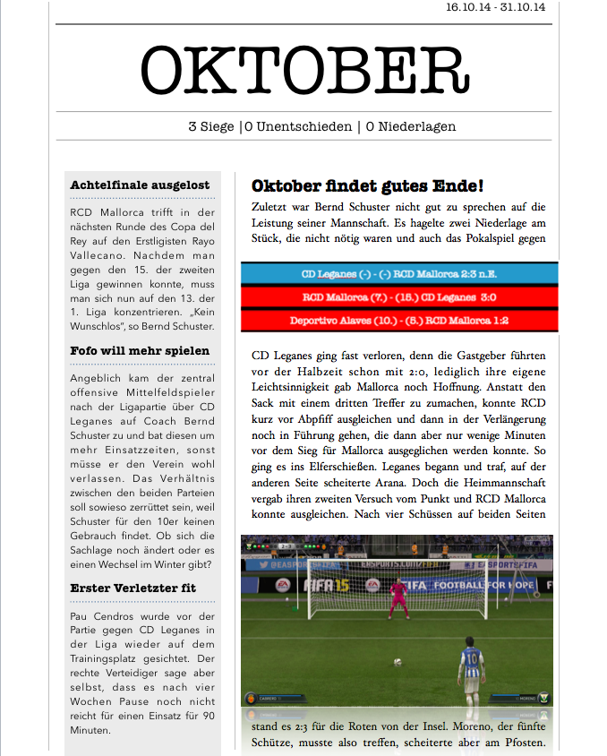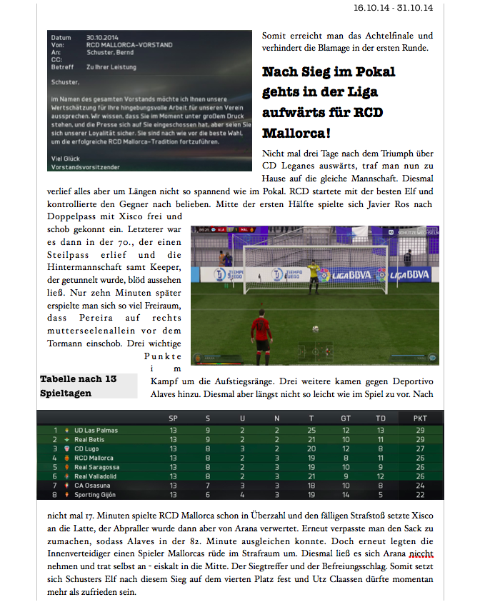 Ziehst das ganze eigentlich richtig gut auf, aber dein Tempo ist einfach ungemein hoch, sodass man kaum mit dem Lesen hinterher kommt. So eine Zeitungsgrafik, wie du sie momentan hast, davon kannst du ruhig zwei einem Bericht zur selben Zeit bringen, das geht von der Länge her voll in Ordnung. Dafür würde ich vielleicht auch mal einen Tag Pause zwischen den Berichten lassen, nicht jeder schaut gerade jetzt im Sommer jeden Tag hier rein. Zocken kannst du ja trotzdem, mach die Berichte einfach normal weiter, dann hast du eben ein paar im Voraus und irgendwann kommen auch wieder Zeiten, wo du weniger Zeit zum Zocken hast, dann hast du Reserve.