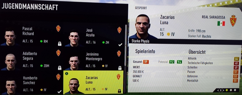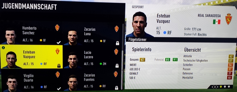 Langsam wird es echt schwer, habe schon einen guten IV hochgezogen aus der Jugend, so einen krassen hatte ich aber noch nie, Potenzial 92-94, nirgends absolute Topwerte, aber er ist ansprechend schnell, hat auch gute Stärke und Ausdauer 73, oder so, ich lasse mich mal überraschen. Er bekommt jetzt seit einiger Zeit Training (1 Einheit pro Woche, da ich einige habe, die ich trainieren will), hat sich bisher aber erst von 58 auf nun fast 60 verbessert. Wird aber schwer werden, alle zufrieden zu stellen, Cabrera und Silva spielen normal Stamm, meine 2 Urus, dahinter mit Popa, Alavedra und Sánchez noch 3 Super Talente, Bagnack ist auch noch verliehen, weiß nicht wirklich, wie ich das mache. :D
