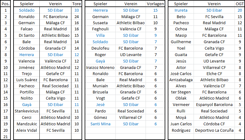Verletzungssorgen bei Eibar. Nach Lopes fiel kurzfristig auch noch Herrera aus, eine Erkältung zwang ihn dieses Spiel gegen Espanyol Barcelona in die Zuschauerrolle. Für ihn rückte Maxi Mendez in die Startformation. Zu sehen war von ihm aber wenig, vermutlich auch deshalb, weil sich Soldado abermals in den Vordergrund spielte. Der 34-jährige ließ in der 19. Minute seinen 10 Jahre jüngeren Gegenspieler sehr alt aussehen, ließ ihn ins Leere rutschen und bezwang Vermeer aus kurzer Distanz. Knappe 10 Minuten später war die Abwehr wieder viel zu weit weg, als Jesé aus kurzer Entfernung zu Soldado passte und der direkt abschloss, Treffer Nummer 29. Espanyol kam nur zeitweise gefährlich vor das gegnerische Tor, dabei patzte Ekiza einmal, doch Irureta konnte parieren.
