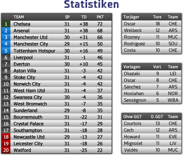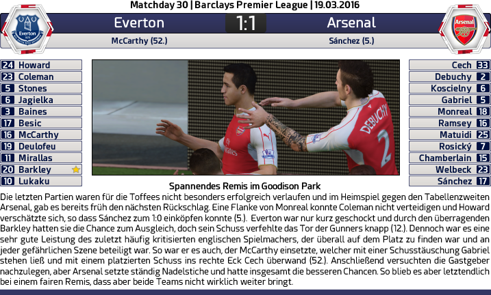 Ist das ungewohnt, Leicester so weit unten zu sehen. Platz 7 ist es momentan, die Chance lebt nach wie vor, einen internationalen Platz sowohl über den Cup, als auch über die Liga zu erreichen. Hoffe, dass du es zumindest irgendwie hinbekommst, Mirallas zu ersetzen. Wie war denn das Finale im COC, reicht dir Platz 6 auch?