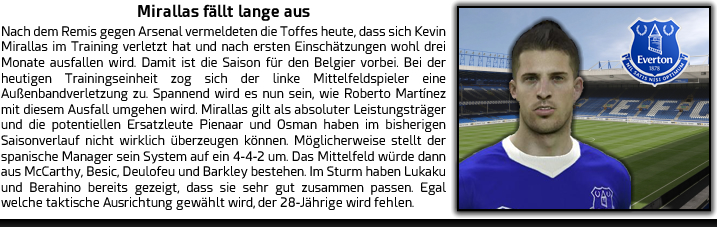 Der Ausfall von Mirallas ist bitter. Was mich wunder ist, das er sich nach dem Spiel gegen Arsenal verletzte