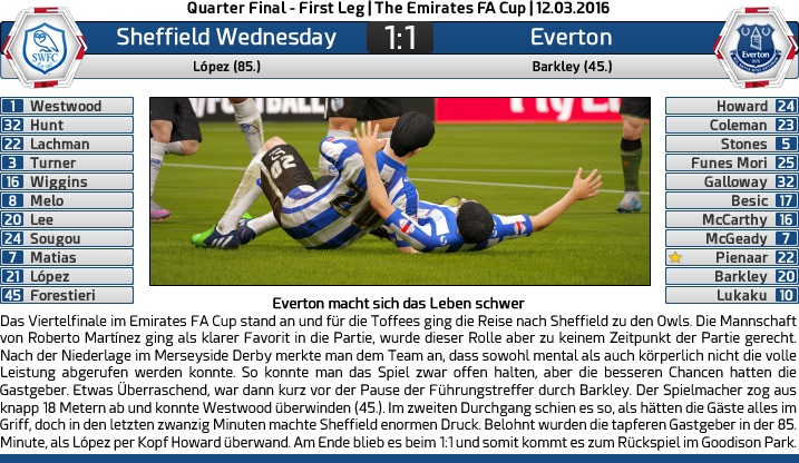 Das 1:1 in der Liga gegen Arsenal war stark - Arsenal ja immerhin Zweiter in der Tabelle - genügt dir aber nicht um vom siebten Platz wegzukommen. Dennoch muss man damit wohl leben. Viel überraschender dagegen die Auftritte gegen Sheffield im Pokal. Zum Glück ist dir am Ende die Blamage erspart geblieben :)