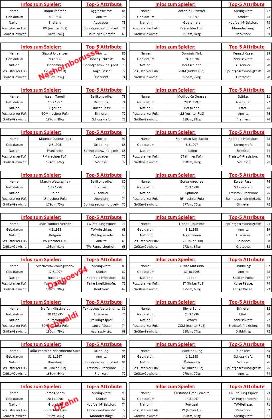So, hier ist die Liste mit den erstellten Spieler, die ab sofort in den Drafts gepickt werden können. Alle Spieler sind und 20 Jahre alt, haben eine GES zwischen 65 und 70 und werden gesondert gehandelt, da sie weder einen MW haben, noch an Einsatzzeiten gebunden sind. Zu den Einsätzen lasse ich mir bis zum Saisonstart noch etwas einfallen, bin noch am überlegen, wie ich das am besten mache, damit man eine halbwegs realistische Entwicklung hinbekommt. Eines ist aber fix garantiert: wenn der Spieler keinen Einsatz bekommt, bleibt seine GES gleich, wird nicht abgewertet.