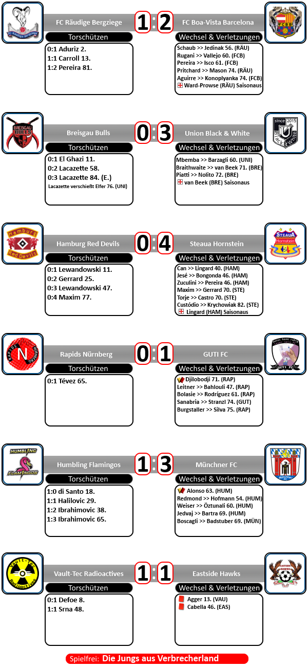 Aufstellungen können bis Do. abgegeben werden, kann normal aber nur die Heimteams ändern. Sollte aber bis Donnerstag keine Aufstellung von den Managern des Heimteams kommen, verliert das Team das Heimrecht! Deshalb bitte auch die Auswärtsteams ein Aufstellung abgeben, für den Fall.