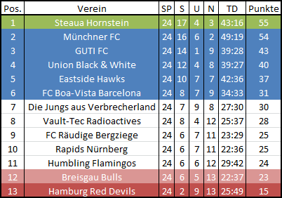 Die Playoffs können dann eigentlich losgehen, wenn ich alle Aufstellungen habe. Dafür wird es drei Phasen geben: Zuerst I: 3.-6. und II: 4.-5., danach 1.-I und 2.-II und als letztes das Finale. Spätester Termin für die erste Phase ist Donnerstag.