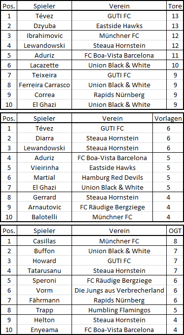 Edit: Ich habe lange überlegt, ob ich in der Sache noch ein wenig Gnade walten lasse, deshalb werden nur alle Spieler abgewertet, die weniger als 2 Spiele haben, seht es als Geschenk. Liste dazu kommt noch. Weiters werden die Gewinner der drei Kategorien (Torschütze, Torvorlagen und ohne Gegentor) um 1 GES-Punkt aufgewertet.
