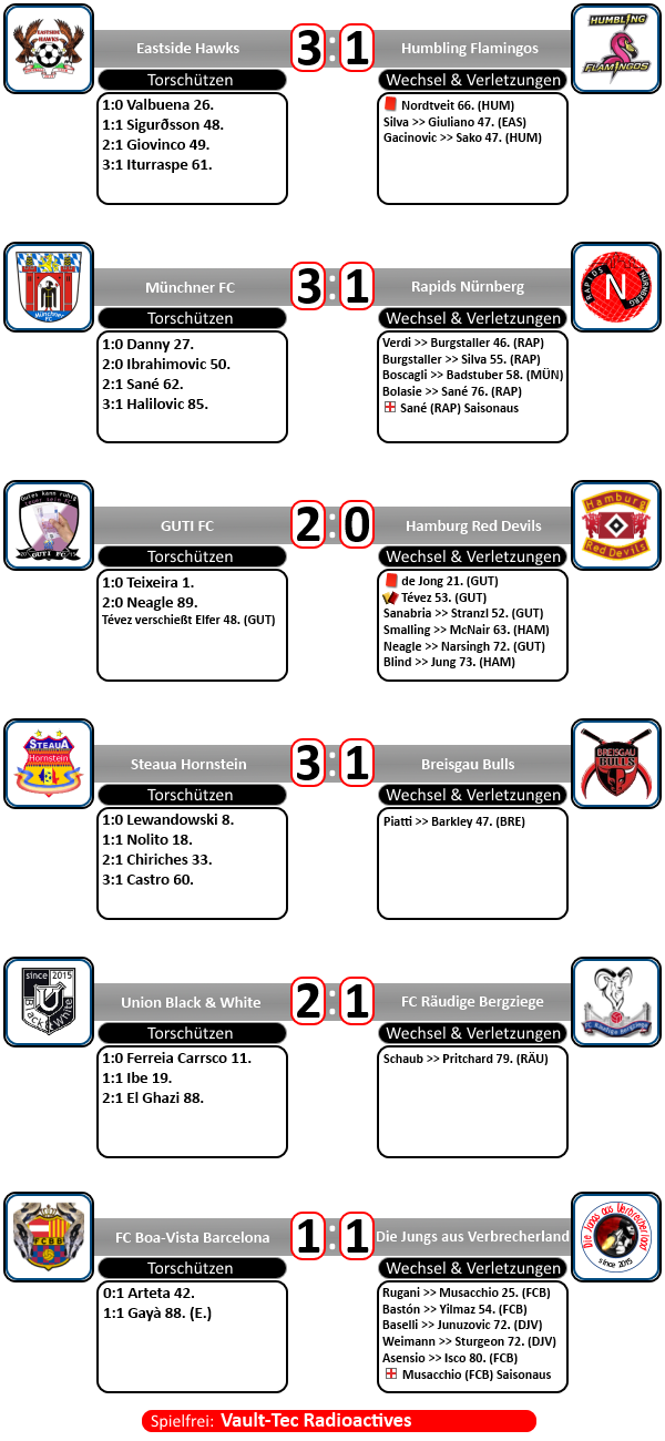 Kleine Planänderung, ich bin morgen auf dem Rapid-Spiel in València, daher verschiebt sich Teil I der Playoffs auf Freitag Abend. Von GUTI FC und Union Black & White fehlen noch die Aufstellungen, sonst werden die Heimrechte umgedreht! :)