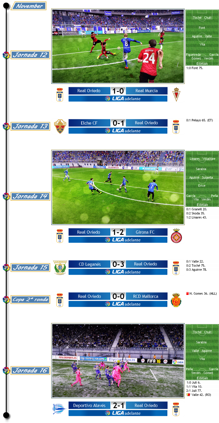 Am nächsten Wochenende zeigte sich, was man in den letzten Spielen befürchtet hatte. Gegen einen Gegner, der, so wie Girona, die Kreativschwäche von Oviedo ausnützen würde und selbst gut und druckvoll agieren würde, standen die Asturier in den ersten 45 Minuten auf komplett verlorenem Posten. Granell mit einem sehenswerten Freistoßtreffer und Skoda aus einem raschen Gegenangriff brachte Girona mit 2:0 in Führung, Esteban musste mehrmals retten und konnte einen noch höheren Rückstand verhindern. So reagierte Sergio Egea, nahm nach 39 Minuten Pablo Sarabia raus und brachte Héctor Font. Zugegeben eine harte Maßnahme, aber wieder brachte die erste Aktion der eingewechselten Kreativspielers direkt Erfolg. Miguel Linares erlief einen Steilpass und drückte den Ball unter dem herauseilenden Keeper hindurch zum Anschlusstreffer ins Tor. Ein ganz anderes Oviedo sah man in der zweiten Hälfte, das nun attackierte und das Tor von Becerra unter Dauerbeschuss nahm. Doch der Goalie glänzte mit Glanzparaden und ließ die Angreifer, allen voran Toché verzweifeln. Gegen Ende ebbte die Partie ab, Oviedo hatte sein Pulver verschossen und stand mit dem 1:2 gegen Girona letztendlich ohne Punkte da.