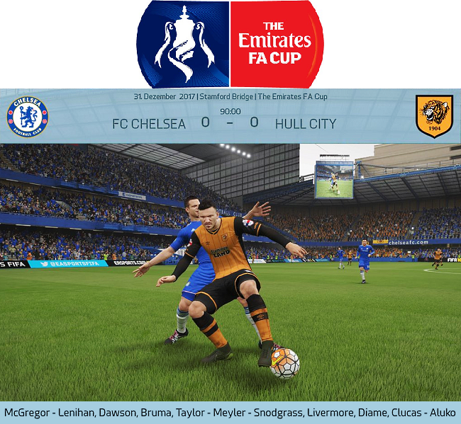 Als nächstes stand das erste richtige Highlight für Ian Holloway an: die 3. Runde des FA Cups gegen den großen FC Chelsea. Die Tigers zu Gast an der Stamford Bridge. Eigentlich waren die Rollen klar verteilt, doch Hull wollte sich zumindest so teuer wie möglich verkaufen. So beschränkte man sich weitestgehend auf eine sichere Defensive, was gegen Willian, Oscar und Aubameyang auch keine all zu schlechte Idee darstellte. Die erste Chance erspielten sich die Blues: Über links tankte sich Kenedy in den Strafraum, von wo aus er dann in den Rückraum zurücklegte. Dort wartete Ramires, welcher die Kugel direkt nahm und sie nur Millimeter über die Querlatte beförderte. In der Folge kam Chelsea deutlich besser in die Partie und erspielte sich weitere gute Möglichkeiten. Doch weder Oscar noch Aubameyang konnten McGregor im Kasten der Tigers überwinden. Mit einigen starken Paraden rettete der schottische Routinier das 0:0 in die Pause. Nach dem Seitenwechsel standen Hull deutlich besser in der Defensive und so tat sich Chelsea zunehmend schwerer vor das gegnerische Tor zu kommen. Die beste Chance im zweiten Durchgang hatten dann sogar die Gäste: nach einem Ballverlust im Mittelfeld schalteten die Tigers schnell um und Diomande kam zu einer sehr guten Schussmöglichkeit - Zentimeter am langen Pfosten vorbei. Kurz vor dem Ende wäre Diomande dann wieder frei durch gewesen, doch Azpilicueta stoppte seinen Antritt mit einer rüden Grätsche von hinten. Folgerichtig gab es die rote Karte für den Basken. Mit dem Schlusspfiff hätten die Blues allerdings fast noch gewonnen: Willian versuchte es aus gut 25 Metern mit einem gefährlichen Aufsetzter. McGregor konnte die Kugel gerade noch so an den Pfosten lenken. Dann war Schluss - die Tigers hatten sich das Wiederholungsspiel in Hull erkämpft. Was eine starke Leistung! |