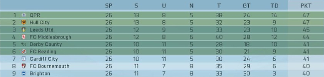 Nach 26 absolvierten steht Hull City mit 47 Punktenauf Rang 2 der Tabelle - punktgleich mit Spitzenreiter Queens Park Rangers. Dahinter lauern Leeds United und Middlesbrough mit nur zwei beziehungsweise drei Punkten Rückstand. Als nächstes steht für die Tigers das Wiederholungsspiel im FA Cup gegen den FC Chelsea an, ehe man zu Nottingham Forest und dem FC Burnley muss. Anschließend warten die Bolton Wanderers auf die Truppe von Ian Holloway. |