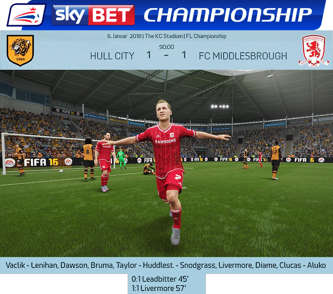 Voller Selbstvertrauen gingen die Tigers also in die nächste Partie. Und es wartete niemand geringeres als der FC Middlesbrough, der größte Rivalen im Kampf um Platz 2. Boro legte gleich los wie die Feuerwehr und wollte so ein schnelles Tor erzwingen: Wildschut versuchte es mit einem Volley aus unmöglichem Winkel, der nur um Haaresbreite über die Latte strich. Kurz darauf tauchte Kike frei vor Vaclik auf, doch Dawson konnte ihn gerade noch am Vollstrecken hindern. Viel passierte dann im ersten Durchgang nicht mehr, die Tigers famden irgendwie keinen richtigen Zugang zur Partie. Und so kam, was kommen musste: kurz vor der Pause tankte sich Carayol über den linken Flügel in den Strafraum und spielte dann einen äußerst präzisen Pass Richtung Elfmeterpunkt, wo Grant Leadbitter den Ball direkt nahm und wuchtig in die kurze Ecke platzierte. Vaclik war zwar noch dran, konnte den Einschlag aber nicht verhindern - 1:0 für die Gäste! Kurz nach Wiederbeginn hätte Leadbitter beinahe einen Doppelpack geschnürt, doch diesmal war Vaclik bei seinem Distanzschuss auf dem Posten. Hull wirkte irgendwie neben der Spur, doch ein Geniestreich von Mohamed Diame brachte die Tigers zurück in die Partie: mit einem Traumpass setzte er Jake Livermore in Szene, welcher vor Agazzi cool blieb und zum 1:1-Ausgleich vollstreckte. Hull war nun deutlich aktiver als zuvor und kam durch Clucas auch noch zu einer guten Chancen, doch Agazzi parierte seinen Versuch stark. Nach einer Ecke sprang der Ball vor die Füße von Kapitän Michael Dawson, der allerdings zu überrascht war und den Ball so aus guter Position weit am Tor vorbei schoss. Beide Teams hatten sich scheinbar mit dem Punkt angefreundet, und so kam es dann auch: das Spitzenspiel zwischen Hull City und dem FC Middlesbrough endete 1:1-Unentschieden. Ein Ergebnis mit dem Hull sicherlich etwas besser leben kann. |