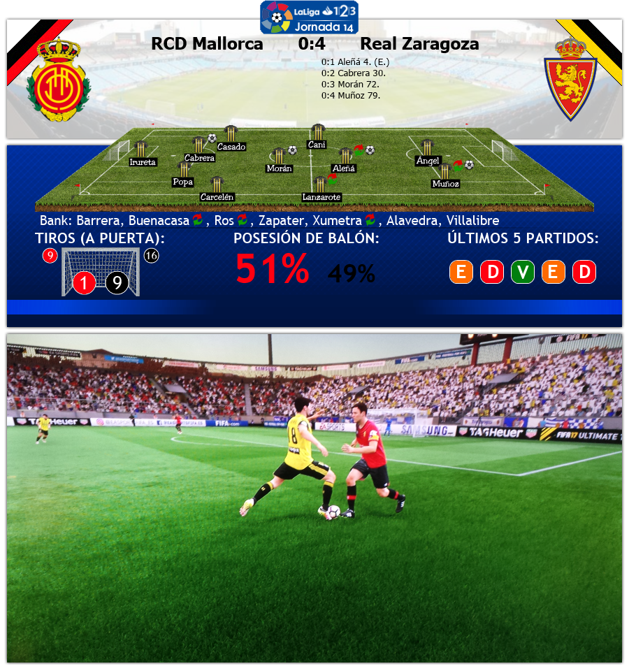Zurück zu alter Stärke, so könnte man die Partie gegen RCD Mallorca am 14.Spieltag beschreiben, doch ein Blick auf die Statistik zeigt schnell, dass Mallorca mit dieser Leistung heute in akuter Abstiegsgefahr ist, das lässt auch Rang 19 nicht leugnen. Viele Fehler und ein dämliches Foul von Campabadal in der 3. Minute an Muñoz läuteten die Niederlage schon früh ein. Carles Aleñá verwandelte den Elfer sicher, alles was von Mallorca in Richtung Tor von Zaragoza kam, war gefährlicher für die Zuschauer auf den Rängen, denn für Irureta im Tor. Nach exakt einer halben Stunde machte Zaragoza Ernst. Nach einer Ecke von der linken Seite stieg der aufgerückte Innenverteidiger Cabrera am höchsten und bezwang Mallorca's Schlussmann. Kurz vor der Pause hatte Lanzarote die Riesenchance auf 3:0 zu erhöhen, aber er verzog im Abschluss knapp.