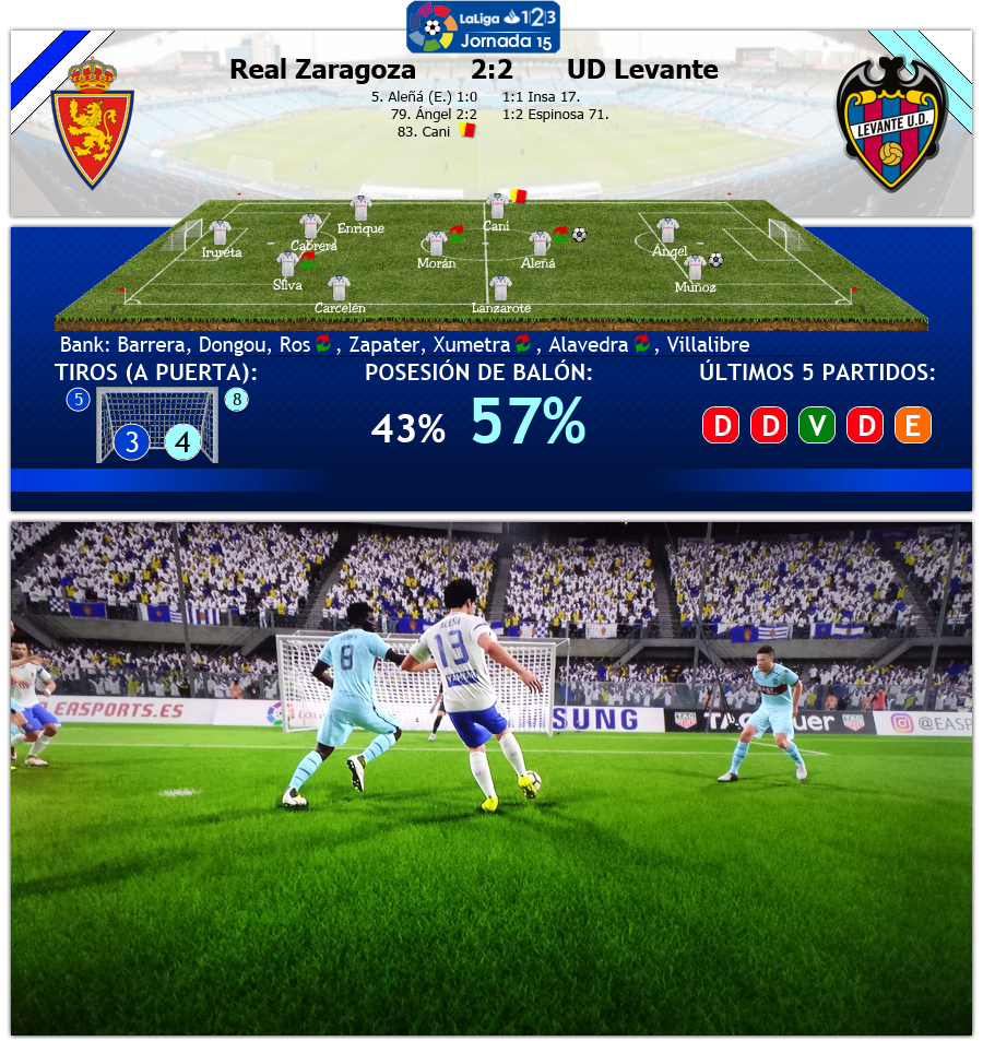 Nur wenige Minuten nach der Pause erwischte es dann auch noch Carles Aleñá. Der quirlige junge Spanier blieb nach einem offensichtlichen Foul, das der inferiore Schiedsrichter nicht einmal einen Pfiff wert fand, liegen und musste ebenfalls runter. Er fällt mit einer Außenbandverletzung ebenfalls rund 3 Monate aus. Es ging hier alles schief für Zaragoza, je länger das Spiel dauerte und so kam es auch, dass Levante in der 71. Minute nach einer schönen Kombination in Führung ging, Espinosa verwandelte einen Zuckerpass von Martins. Aber Zaragoza gab sich nicht auf und kam etwa 10 Minuten vor dem Ende durch Ángel Rodríguez noch zum Ausgleich. Auch wenn Cani wenig später noch gelb-rot sah, mit dem 2:2 konnte man gut leben, die Verletzungen von Aleñá und Silva wiegen schwer!