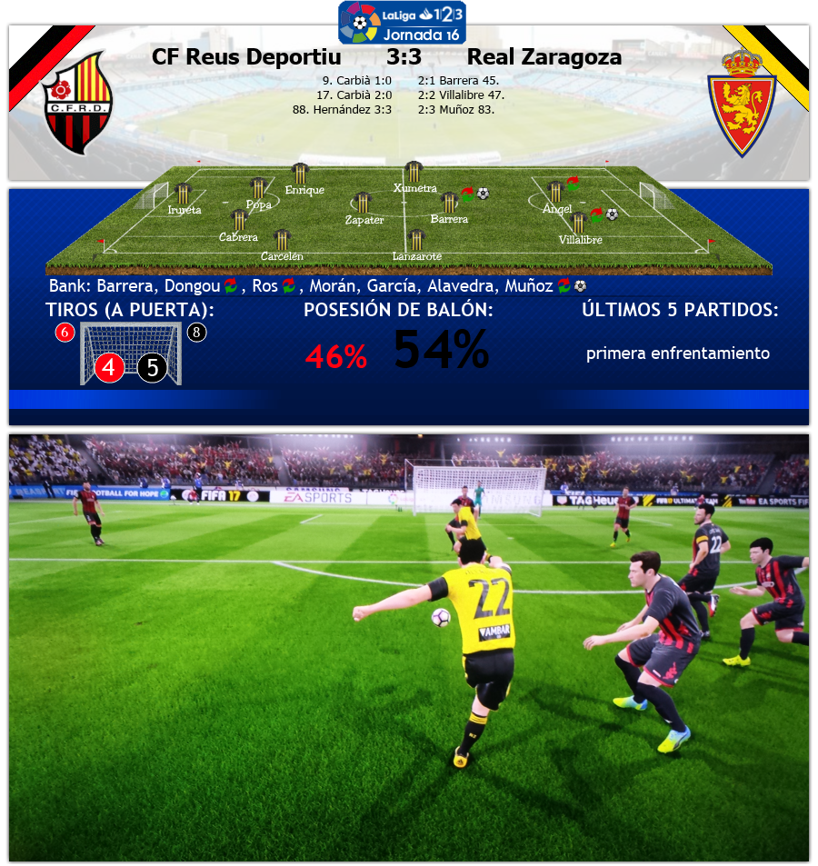 Eine verrückte Partie gab es eine Woche später bei Reus Deportiu zu sehen. Beim Aufsteiger im Estadi Camp Nou Municipal, welches mit 4.250 Zuschauern nahezu ausverkauft war, konnte man zu Beginn klar sehen, wie sehr ein Silva in der Innenverteidigung fehlte. Kaum Zuordnung und aufgescheucht wie ein Hühnerhaufen präsentierte sich Zaragoza und bekam dafür die Rechnung. Ausgerechnet Fran Carbià, an dem Zaragoza interessiert war, schlug zweimal zu und brachte Reus hier schnell mit 2:0 in Front. Zaragoza perplex, wusste lange Zeit keine Antwort, das Fehlen von Aleñá und vorallem Silva wirkte sich spürbar aus, dazu fehlte mit dem gesperrten Cani ein weiterer Schlüsselspieler. Aber kurz vor der Pause keimte wieder Hoffnung auf, als Álex Barrera nach einem Zuspiel von Zapater die Überischt behielt und auf 2:1 verkürzte. Psychologisch ein wichtiger Treffer.