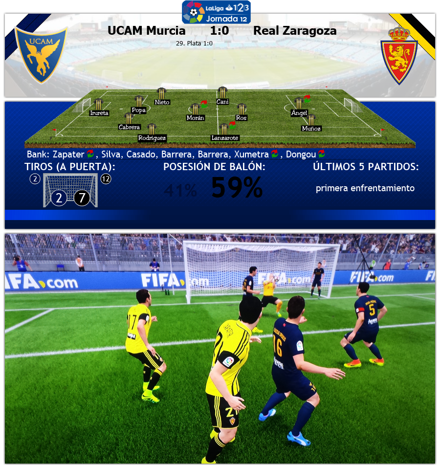 Nur 4 Tage später stand in der zweiten Liga das Spiel gegen UCAM Murcia an. Die ganz in dunkelblau spielenden Gastgeber lagen auf einem ordentlichen 14.Platz und hatten zuletzt Rayo Vallecano ein 1:1 abgeknöpft. Zaragoza sollte also gewarnt sein. Murcia begann engagiert, aber scheiterte vorerst noch an der fehlenden Klasse. Zaragoza tat sich gegen die tief stehenden 'Curas' schwer, zumeist endeten die Aktionen kurz vor dem Strafraum. In der 29. Minute schaffte es Murcia aber ein erstes Mal gefährlich in den gegnerischen Strafraum, am langen Eck hatte man auf Nono Plata völlig vergessen und der Spanier traf zum überraschenden 1:0 für Murcia. Eine neue Situation für Zaragoza in dieser Saison, ein erstes Mal musste man einem Rückstand in einem Pflichtspiel nachlaufen. Aber dem Spiel tat das keinen Abbruch, Zaragoza kombinierte und spielte, meist zu schnell für UCAM Murcia, aber am Schlussman kamen sie nicht vorbei.