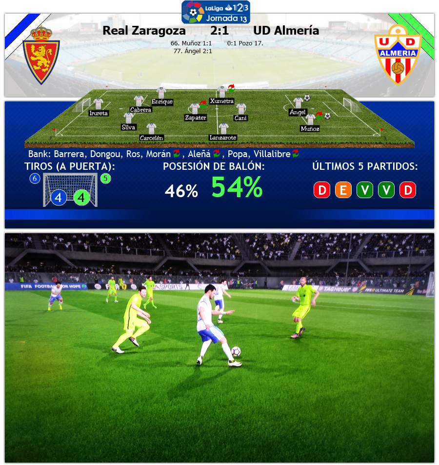 Vorerst einmal nicht, auch wenn Morientes Cani zur Pause auf den linken Flügel gezogen und Aleñá gebracht hatte, wurde die Partie nur unwesentlich besser. Doch nach gut einer Stunde kam Morán für Zapater und der brachte frischen Schwung. In der 66. Minute sah Ángel seinen Sturmpartner Muñoz starten und spielte einen guten Pass ins Loch, den die Sevilla-Leihgabe eiskalt verwandelte. Zaragoza wollte nun mehr und setzte Almería unter Druck. Die Abwehr bröckelte und in der 77. Minute fiel sie. Diesmal war es ein genau getimter Pass von Carles Aleñá auf Ángel und der drehte die Partie, 2:1 für Zaragoza. Almería konnte nicht mehr antworten und musste nach der Führung letztendlich noch alle drei Punkte abgeben.