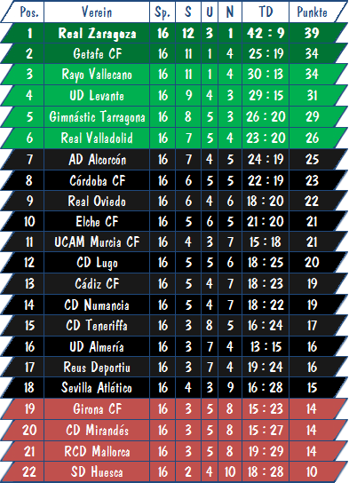 Die spanische Liga interessiert mich eigentlich Null und die zweite noch weniger, aber ich werde trotzdem versuchen hier am Ball zu bleiben. Der Zaragoza-Express rollt ja momentan noch recht ungehindert Richtung oberhaus, mal schauen ob es hier einen Durchmarsch geben wird oder es doch noch mal brenzlig werden könnte:yes: