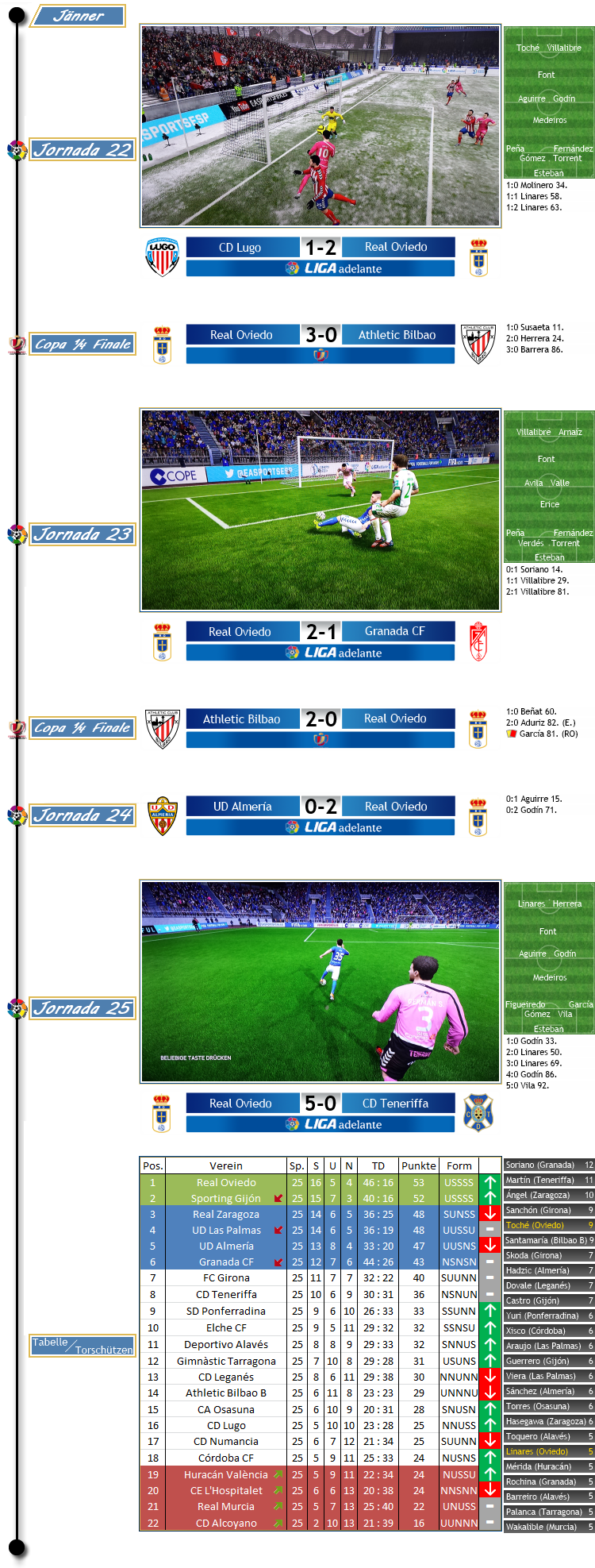 Am 22.Spieltag ging es für Real Oviedo ins verschneite Lugo. Bei Temperaturen knapp unter dem Gefrierpunkt brauchte Oviedo ein wenig, um warm zu werden, die Gastgeber kamen anfangs besser ins Spiel und gingen nach einer Druckphase folgerichtig durch Molinero in der 34. Minute in Führung. Oviedo schonte für den Cuphit gegen Bilbao einige Stammspieler, der auffälligste unter den neuen war Flügelspieler Godín, der immer wieder für Gefahr sorgte, aber Lugo Schlussmann José Juan konnte einige Versuche des 16-jährigen entschärfen. Zur Pause ersetzte dann Miguel Linares Toché, der heute seine Gefährlichkeit vermissen ließ. Gefährlich wurde es wie schon in der ersten Hälfte am ehesten, wenn Godín am Ball war. In der 58. Minute sorgte aber Héctor Font mit einem grenzgenialen Lochpass auf Linares für den Ausgleichstreffer, der alternde Goalgetter kam wieder besser in Fahrt, der Dank, dass ihn Sergio Egea nie aufgegeben hatte. Nur 5 Minuten später nahm Linares eine Flanke von Godín wuchtig per Kopf und drehte die Partie, 1:2, eine Leistung wie in seinen besten Zeiten. Damit spielte er sich neben dem heute auch blassen Villalibre wieder in den Blickpunkt.