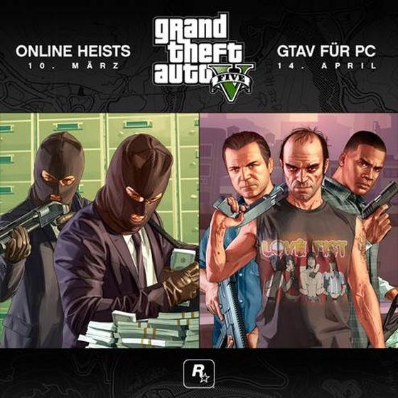 GTA Online am 10. März. Die Heists erweitern den Online-Modus um eine neue kooperative Spielerfahrung für bis zu vier Teilnehmern, die es den Spielern ermöglicht, sich für eine Reihe von mehrteiligen Überfällen und Raubzügen in Los Santos und Blaine County zusammenzuschließen.