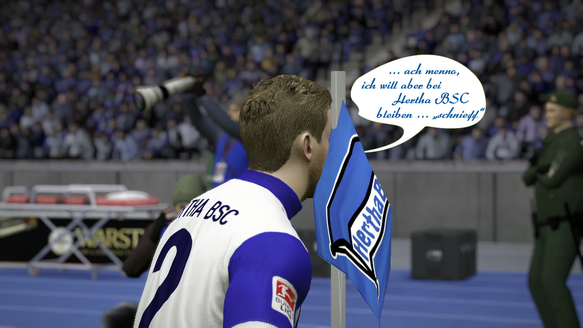 Hinweis: Da die Eckfahne sehr schön in Fifa 15 mit der Kamera kontrolliert werden kann, sage ich es gleich, eine Seite ist gespiegelt, wird aber auch im realen Dasein der Fahnen so sein, da es sich um einen Stoff mit Motiv handeln wird. Auf alle Fälle ist das nicht zu verhindern. Aber besser als Leuchtfarbe Rot in allen Stadien.Zitat: