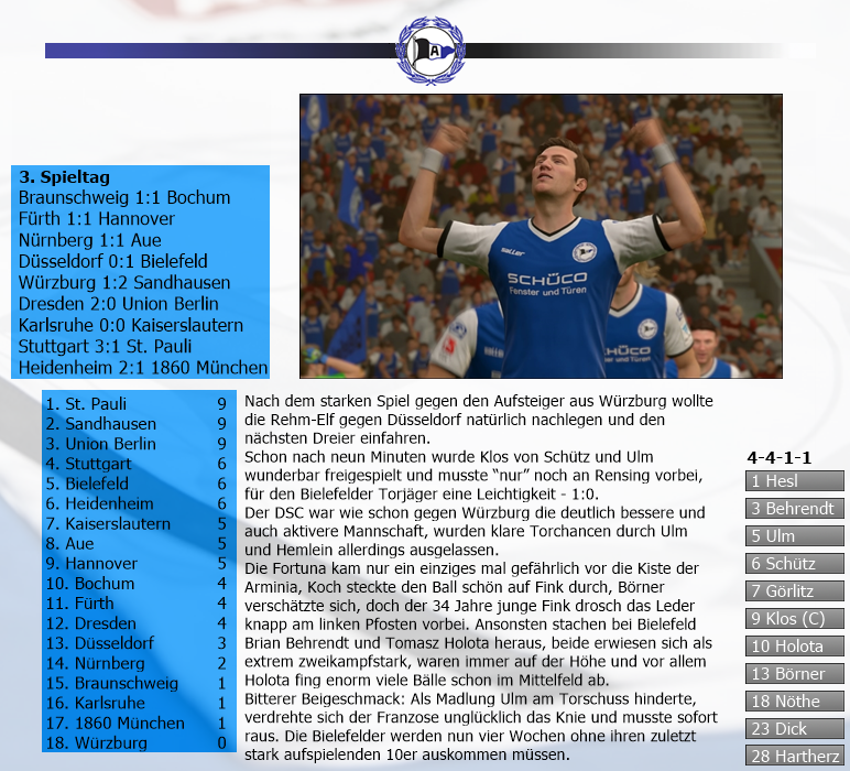 Hartherz und Ulm sind deine ersten Torschützen, ist ja weitgehend ungewöhnlich, dass Klos da noch nicht auftaucht.^^ Aber der kommt sicher noch in Fahrt...wie man dann gegen Düsseldorf ja schon sehen konnte. Defensiv bis jetzt sehr stabil, 1 Gegentor in drei Spielen spricht für sich. :)