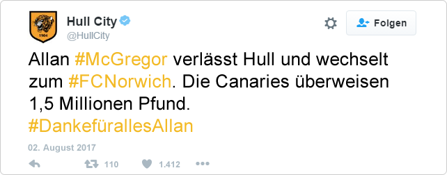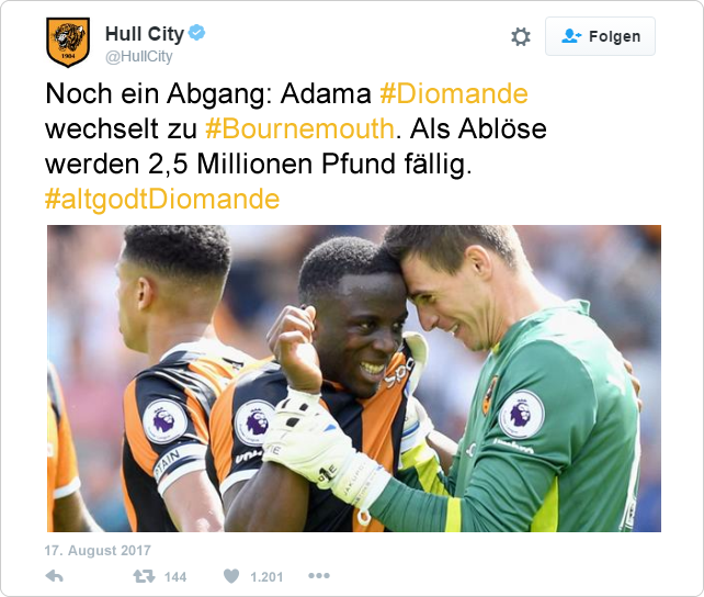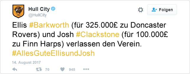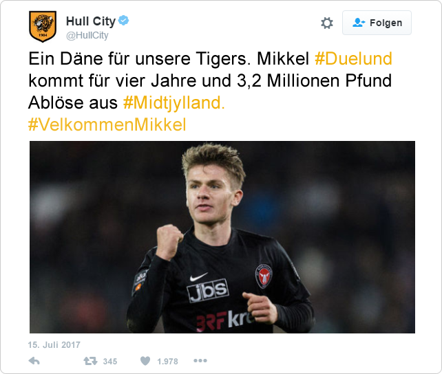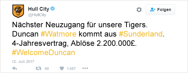 Als Ersatz verpflichteten die Tigers kurz darauf Duncan Watmore. Der 23-Jährige rechte Mittelfeldspieler kommt vom Absteiger FC Sunderland und kostet rund 2,2 Millionen Pfund.