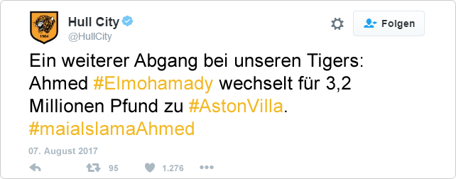 Ahmed Elmohamady spielte seit 2013 für Hull City, doch in der letzten Spielzeit kam er nicht an Robert Snodgrass vorbei und bat darum den Verein verlassen zu dürfen. Letztendlich sicherte sich Zweitligist Aston Villa für 3.200.000£ die Dienste des ägyptischen Nationalspielers.