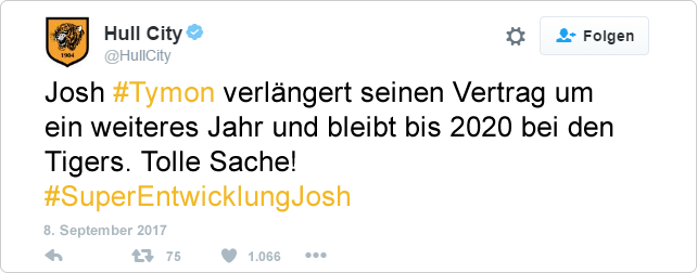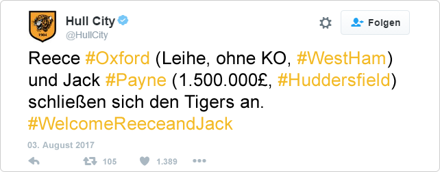 Zusätzlich schnürt mit Reece Oxford in der kommenden Spielzeit ein großes Talent die Schuhe für die Tigers. Der erst 18-Jährige englische Innenverteidiger wird allerdings vorwiegend als Backup fungieren. Für beide Spieler gibt es keine Kaufoption.