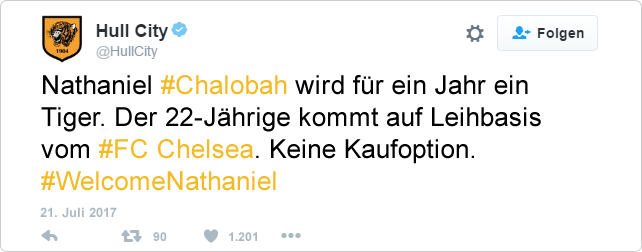 Vier Spieler verpflichteten die Tigers fest, doch zusätzlich wurden auch zwei Spieler ausgeliehen. Vom FC Chelsea wechselt Nathaniel Chalobah für eine Saison nach Hull. Der zentrale Mittelfeldspieler kam unter Antonio Conte kaum zu Einsätzen und hofft nun auf Spielpraxis.