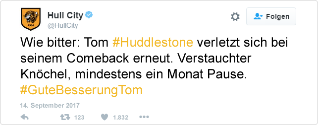 Verletzungsupdate | 14.07.2017 - Bei der heutigen Trainingseinheit der Tigers verletzte sich Tom Huddlestone in einem Zweikampf. Die Diagnose lautet Achillessehnenriss und der zentrale Mittelfeldspieler wird wohl mindestens sechs Wochen fehlen. Damit verpasst er definitiv den Community Shield gegen Meister FC Chelsea.