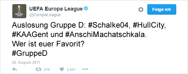 In der Europa League kriegt man eine relativ bunte Mischung mit interessanten Teams und mit Russland sicherlich eine sehr interessante Reise für deine Jungs. Ich hoffe selbstverständlich auf sechs Punkte gegen das blaue Pack.