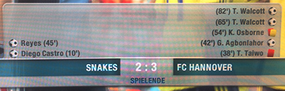 Naja, den ersten Elfer verwandel ich mit Max Gradel sehr souverän. Dann schießt Coutadeur an den Pfosten. Florent Sinama-Pongolle trifft auf meiner Seite recht sicher. Dann meint der Spieler Campbell er wäre Ramos, schießt meilenweit drüber. Danach tritt Romain Alessandrini an, verzögert, schickt den Torwart in die falsche Ecke und verwandelt. Und dann kommt das beste. Baca meint er müsse es genauso machen, verzögert und schießt in die Mitte. Da ich aber immer einfach nur leicht nach rechts und link laufe, und nicht springe (wie gesagt geht nicht), hält Janot den Ball weil er genau reinläuft. Damit bin ich im Coupe de Ligue eine Runde weiter.:D