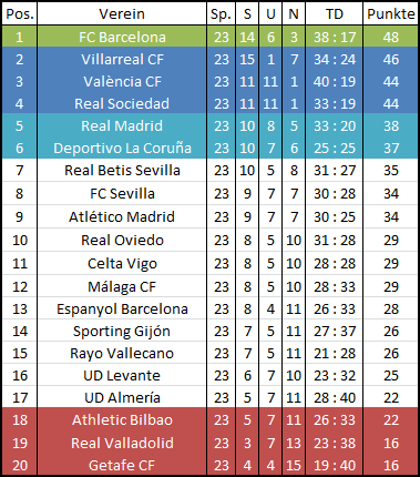 Gemischte Ergebnisse für Real Oviedo... zur Zeit steht man auf einem tollen 10. Tabellenplatz in der Primera Division (oder sagt man Liga BBVA? Ich blicke da nicht mehr durch!) mit beruhigenden 29 Punkten... mit dem Abstiegskampf sollte man eigentlich nichts zu tun haben, da man sich gut absetzen konnte... für Europa wird es aber auch nicht reichen, was allerdings auch niemand erwartet... man wird die Saison wohl ruhig zu Ende spielen können und letztendlich einen Mittelfeldplatz belegen, was für einen Aufsteiger eine gute Leistung wäre... ein einstelliger Tabellenplatz wäre vielleicht ein Ziel welches man realistisch angehen könnte?! In der Copa del Rey konnte man ins Halbfinale einziehen und Valencia ausschalten... tolle Leistung... im Halbfinale (Hinspiel) gab es ein 1:3 bei Villarreal... muss aber noch lange nicht das Aus bedeuten, zu Hause im Rückspiel ist noch alles möglich!