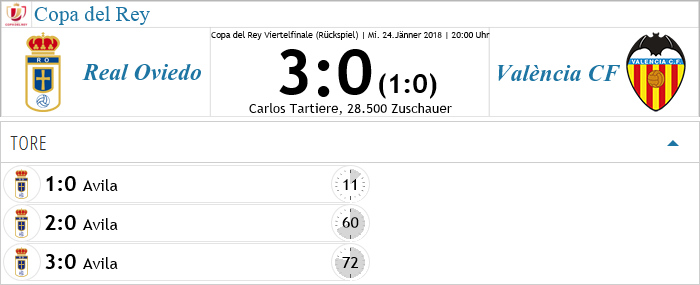 Alle heiligen Momente gibt es im Fußball einmal ein Wunder. So eines würde wohl Real Oviedo heute auch benötigen, um das 0:2 aus dem Hinspiel noch umzudrehen. Zudem hieß der Gegner València, aktuell Tabellen-3. in der Liga und erst einmal in der Liga verloren. Sergio Egea schonte einige Stammkräfte, brachte viele junge Spieler und einen Namen sollte man sich, auch außerhalb von València besonders gut einprägen, Felix Avila. Der 18-jährige Spanier, der in seine zweite Profisaison geht, lieferte eine unfassbare Leistung ab und ballerte València im Alleingang aus der Copa. Mit drei Treffern gelang ihm zudem der erste Hattrick seiner Karriere, es hätte keinen besseren Zeitpunkt dafür geben können. Sergio Egea kam nach der Partie aus dem Staunen und Jubeln gar nicht mehr heraus: 'Wir wissen, was wir an Felix haben, er hat großes Talent und wenn er weiter an sich arbeitet, kann er ein ganz großer werden, das heute war aber unglaublich, ich hatte nach dem 0:2 im Hinspiel ehrlich gesagt nur noch wenig Hoffnung.' Auch die Presse war voll mit Avila's Gesicht, das sensationelle 3:0 gegen València wird in die Historie des Clubs als 'Wunder von Oviedo' eingehen!