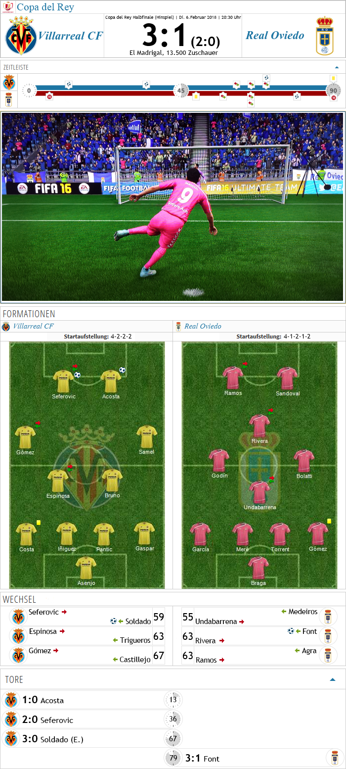 Mit einigem Losglück kam Oviedo letzte Saison schon weit in der Copa del Rey, auch diese Saison konnte man sich bisher nicht beklagen, und auch im Halbfinale war man unter dem FC Barcelona, Atlético Madrid und Villarreal der krasseste Außenseiter. Doch die Losfee meinte es einmal mehr gut mit dem Aufsteiger, man bekam Villarreal zugelost, auf dem Papier die leichteste Aufgabe, aber das gelbe U-Boot spielte eine überragende Saison bisher, lag nur 2 Punkte in der Tabelle hinter Spitzenreiter Barcelona und war deshalb der klare Favorit. Doch dieser Abend hätte für den Favoriten ganz bitter beginnen können, denn in der 5. Minute foulte Mario Gaspar Sandoval im Strafraum, der Mexikaner nahm sich des Elfers selbst an, zielte jedoch zu genau und jagte diesen ans Lattenkreuz, großes Pech für Oviedo. Villarreal erkannte, dass man mit vollem Ernst bei der Sache sein sollte und legte zu. Mit Erfolg, denn nach einer gelungenen Kombination über mehrere Stationen vollendete Acosta in der 13. Minute zum 1:0. Oviedo hatte Mühe, die wild anstürmenden Gastgeber irgendwie vom Tor fernzuhalten, aber Meré und Braga lieferten gute Leistungen ab. Doch in der 36. Minute patzte Kike Torrent, legte den Ball beim Herausspielen genau zum Gegner, Villarreal schaltete wieder schnell, der Ball kam in die Spitze zu Haris Seferovic und der Schweizer erhöhte auf 2:0. Oviedo bisher ohne Land zu sehen, daran änderte auch die zweite Hälfte nur wenig. Nach der Wechselphase hatte Roberto Soldado das 3:0 auf dem Fuß, traf jedoch Meré an der Hand, ein Pfiff folgte, schon wieder Elfer. Soldado schnappte sich diesen und hatte Glück, denn Braga war mit der Hand dran, konnte den scharfen Ball aber nicht mehr entscheidend ablenken. Villarreal schaltete nun merkbar zurück und wurde nachlässig, was zur Folge hatte, dass sich Oviedo in den Strafraum kombinieren konnte und Héctor Font im Gewusel zum 3:1 Anschluss traf. Ein wichtiges Auswärtstor und beinahe hätte sich Villarreal noch der guten Leistung beraubt, denn in der Nachspielzeit legte Jaume Costa Salvador Agra im Strafraum, wieder gab es Elfer. Aber auch Héctor Font hatte das Pech auf seinem Schuh kleben, knallte den nächsten Elfer ans Aluminium, bitter bitter für Oviedo! So blieb es beim 3:1 für Villarreal, keine schlechte Ausgangsposition, aber man war gewarnt für das Rückspiel!