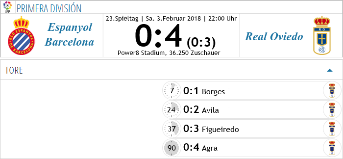 Nach der schwachen Vorstellung unter der Woche gegen Betis forderte Sergio Egea gegen Espanyol Barcelona eine Reaktion und bekam diese auch. Oviedo zeigte nun auch in der Liga sein Cup-Gesicht und überrollte Espanyol Barcelona in allen Belangen und Phasen der Partie. Gegen die Katalanen hatte man zudem gute Erinnerungen, das erste Spiel nach der Rückkehr in La Liga fand eben gegen Espanyol statt, man konnte es zuhause mit 2:0 gewinnen, nun setzte man aber noch einen drauf. Celso Borges, Felix Avila und Afonso Figueiredo mit einem sehenswerten Distanzschuss stellte schon vor der Pause eine deutliche Führung her und lenkte das Spiel in eine eindeutige Richtung. Zwar bekam Espanyol die in der ersten Halbzeit inferiore Defensive besser in den Griff, am Ausgang des Spiels änderte sich aber nichts mehr, in der Nachspielzeit lieferte Moreno noch einen kapitalen Schnitzer im 1-gege-1 als letzter Mann gegen den eingewechselten Salvador Agra, der zum 0:4 Endstand traf, eine Demontage, welche die Espanyol-Fans mit Pfiffen für ihr Team quitterten.