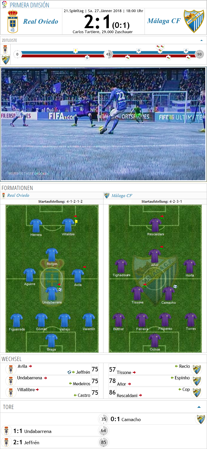 Sergio Egea schenkte dem Team nach dem furiosen 3:0 in der Copa einen trainingsfreien Tag und hoffte damit, auch die Fitness der Spieler für das Spiel gegen Lieblingsgegner Málaga in den Griff zu bekommen. Dennoch musste Oviedo an zwei Positionen umstellen, für den nicht ganz ausgeruhten Medeiros rückte Undabarrena in die Startelf, Cupheld Felix Avila durfte auf seiner rechten Seite von Beginn an ran. Málaga war gewarnt, doch schien diesmal gut eingestellt zu sein. In der ersten Halbzeit ließ man wenig zu, stand hinten kompakt und nutzte seine einzige Gelegenheit durch Camacho zur nicht unverdienten Pausenführung. Oviedo kam aber stärker aus der Kabine, machte Druck und drängte auf den Ausgleich. In der 64. Minute fühlte sich nach einer Eckballvariante keiner für Undabarrena zuständig, der Baske zog aus gut 20 Metern ab und glich aus. Bekam Málaga nun wieder das Zittern? Es schien so, denn hinten agierte man nervös und ängstlich und nach vorne war ab der 60. Minute komplett Fehlanzeige. Und dazu kam noch, dass Oviedo beim Wechseln ein goldenes Händchen bewies. Der eingewechselte Jeffrén bekam nach einem Angriff zu viel Platz im Rückraum, zog von der Strafraumgrenze ab und jubelte ausgelassen über sein erstes Tor für Oviedo. Lange hatte sich der schon angekündigt, zuletzt hatte das ehemalige Barca-Juwel mit Aluminiumtreffern Pech, nun klappte es endlich. Málaga kam nach dem 2:1 nicht mehr zurück, leidet erneut am Oviedo-Trauma und muss die nächste Niederlage gegen die Carbayones einstecken.