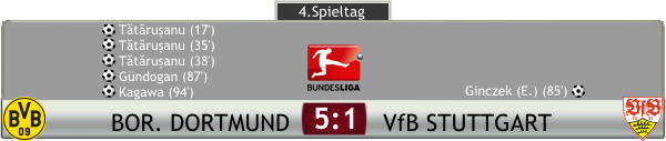 'Sorin, du bist echt nicht mehr normal!' gratulierte mir Alexandru Maxim, als ich mit dem Ball in der Hand in Richtung Katakomben des Signal Iduna Park verschwand. Nach den ganzen privaten Problemen und deren Beseitigung fühlte ich mich sorglos und konnte das auch auf dem Platz zeigen. 5:1, das glich einer Hinrichtung, wenn du dich defensiv aber so dämlich anstellt, darfst du dich nicht wundern, wenn eine Klasse-Mannschaft wie der BVB oder Bayern München das eiskalt auszunützen wissen, pflegte einst Bogdan zu sagen, nachdem wir eine Niederlage von Steaua Bukarest in der Champions League gegen Real Madrid ansehen mussten. Damals waren wir noch klein, das hatte uns ziemlich fertig gemacht, unser Team so untergehen zu sehen, heute wusste ich auch, wie es sich anfühlte, dabei auf der anderen Seite zu stehen. Dabei hatten wir ziemliches Glück, als unsere umgebaute Abwehr, Mats Hummels entschied sich am letzten Tag des Transferfensters noch, zu Chelsea zu wechseln, Timo Werner unbeaufsichtigt zum Abschluss kommen ließ und dieser den Ball auf rund 20 Metern an die Latte knallte. Während Stuttgart offensiv nicht viel schlechter war als wir, lagen jedoch in der Defensive Welten zwischen uns. Aus diesem Grund und auch, weil wir heute gnadenlos effektiv agierten und mich Gündogan vor der Pause dreimal perfekt bediente, war die Sache schon nach 45 Minuten gegessen, mein erster lupenreiner Hattrick für den BVB, ein tolles Gefühl. Nach 60 Minuten wurde ich dann vom Platz genommen und für das anstehende CL-Spiel geschont. Marvin Duksch durfte für mich ran, doch der konnte sich nicht so in Szene spielen, wie es mir gelungen war. Stuttgart gab noch nicht auf und nach einem Handspiel von Sokratis im Strafraum brachte Ginczek die Schwaben nochmals heran, aber quasi im Gegenzug ließ der heute überragende Ilkay Gündogan nach zuvor 3 Assists mit dem Treffer zum postwendenden 4:1 keine Zweifel aufkommen. In der Nachspielzeit traf noch Shinji Kagawa zum 5:1 Endstand, nachdem bei Sunjic gedanklich die Partie wohl schon zu Ende war. Ich blieb nach der Partie noch kurz im Stadion, unterhielt mich in der Tiefgarage mit Alexandru, zeigte ihm Bilder meiner neuen Wohnung, die ich ihm gerne auch gezeigt hätte, aber leider fuhr das Team gleich mit dem Bus wieder zurück nach Stuttgart, sodass dafür keine Zeit blieb.