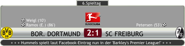 Der nächste Gegner war der SC Freiburg. Vor heimischem Publikum hatten wir mit dem Aufsteiger aber gehörige Probleme, der beherzt kämpfte und uns das Leben schwer machte und eng am Mann stand. Zwar konnten wir plangemäß in der 10. Minute durch Weigl nach einem schwerern Stellungsfehler der Abwehr in Führung gehen, aber Freiburg blieb vorallem durch Standards gefährlich. Zudem konnten sie erfolgreich unsere Angriffe unterbinden, sodass es mit dem 1:0 in die Pause ging. Nach dem Wechsel kam Reus neu ins Spiel, doch das änderte nichts an der Tatsache, dass sich Freiburg ausgezeichnet schlug und alles unsere Angriffe abfangen konnte. In der 52. Minute versuchte sich Mkhitaryan aus der Distanz, der Schuss wurde aber geblockt, landete in einem weiten Bogen bei der Offensivabteilung von Freiburg, Weigl verlor das Kopfballduell im Mittelfeld und mit einem steilen Pass sah sich auf einmal Roman Bürki mit einer 1-gegen-1 Situation gegen Petersen konfrontiert. Der Torjäger der Badener blieb cool und glich aus, für einen Moment Stille im Stadion. Damit schienen nur die wenigsten gerechnet zu haben. Und Freiburg schien noch nicht fertig zu sein, denn nur 10 Minuten später war Petersen wieder durch, scheiterte diesmal aber an Bürki's linkem Fuß. Und auch die Ecke brachte uns in große Bedrängnis, im Getümmel wusste keiner so recht, wo der Ball ist, nur Grifo hatte den Überblick, traf aber Sokratis' Oberschenkel, von wo aus der Ball an die Stange sprang. Da hatten wir jetzt gehörig Glück, was auch Thomas Tuchel nicht gefiel, der von draußen wild gestikulieren versuchte, wieder Ordnung in unsere Abwehr zu bekommen. Das gelang nicht wirklich, Freiburg agierte plötzlich mit gehörig Selbstvertrauen wie der FC Barcelona und drückte uns hinten rein. Alleine Bürki war es zu verdanken, dass es noch immer 1:1 stand. Von der Bank aus zitterte ich mit und hoffte, dass Ramos, der für mich in der 69. Minute ins Spiel kam, oder Gündogan oder sonst wer, doch noch das 2:1 erzielen würde. Danach sah es anfangs gar nicht aus, aber in der Schlussphase konnte Ilkay Gündogan nach einem herrlichen Solo nur mit einem Foul gestoppt werden, der Unparteiische gab Elfmeter, eine haarige Szene, die Bilder konnten nicht sicher belegen, dass das Foul wirklich innerhalb war. Uns war es egal, Ramos traf souverän und führte uns zu einem sehr glücklichen 2:1 Heimsieg gegen überraschend starke Freiburger.