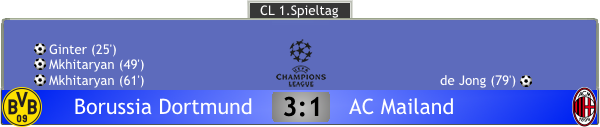 Im ersten Gruppenspiel der Champions League erwarteten wir vor heimischem Publikum den AC Mailand. Bei den Italienern ging zuletzt ein Aufwärtsruck durch die Mannschaft, nach der hartnäckigen Formkrise konnten sich die Rossoneri erstmals seit einigen Jahren wieder für die Champions League qualifizieren und hatten in unserer Gruppe durchaus Chancen, die K.O. Phase zu überstehen, man würde sich wohl mit Zenit St.Petersburg um den zweiten Platz matchen, Anderlecht hatte nur Außenseiterchancen. Wir mussten heute auf den gesperrten Gündogan verzichten, der in der letzten Saison im letzen Spiel noch eine Sperre ausgefasst hatte, aber dem Spiel schien das nur bedingt zu schaden. Zwar dauerte es bis zur 25. Minute, ehe wir unsere erste Chance zur Führung nutzten, aber das war vorallem der Tatsache geschuldet, dass der Gegner sehr gut hinten stand und sich nicht herauslocken ließ. Mit meiner Vorlage auf den mitgelaufenen Matthias Ginter gelang es uns aber, die Abwehr auszuhebeln und in Führung zu gehen. Kurz nach der Pause machte uns 'Miki' das Leben noch eine Spur einfacher, als er nach einem verunglückten Klärungsversuch einfach mal aus der Distanz draufhielt und das 2:0 erzielte. Nun musste Mailand kommen und es ergaben sich Räume für uns. Nach einer guten Stunde hatte dann de Jong eine große Chance auf den Anschlusstreffer, doch er verfehlte den Steilpass um Zentimeter. Danach ging es blitzschnell, Piszczek hielt den Ball im Spiel, passte auf Ginter, der leitete den Ball direkt zu mir weiter, ich konnte einige Meter gehen, sah dann Reus starten und spielte den langen Pass. Reus zog nach außen, flankte zur Mitte, wo erneut Mkhitaryan angerauscht kam und wuchtig einköpfte. In der 72. Minute durfte ich dann runter, heute ohne Treffer, der junge Tammo Harder bekam eine Chance für die Schlussphase. In dieser mussten wir noch einen Gegentreffer einstecken, als de Jong einen Freistoß sehenswert um die Mauer drehte und Bürki bezwang, dennoch waren die 3 Punkte heute nie gefährdet.