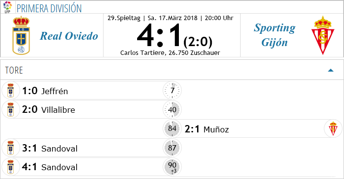 http://fs5.directupload.net/images/u...7/b37gpzsb.png 93.Min: GOOOOOLLLLL de Ramiro Sandoval! Gijón wirft nun alles nach vorne und ist hinten offen wie ein Scheunentor. Oviedo zögert mit dem Angriff, dennoch gelingt der öffnende Pass auf die rechte Seite, Sandoval zieht zur Mitte und bezwingt Cuéllar erneut, 4:1 für Real Oviedo, der Deckel ist drauf, ein extrem wichtiger Sieg im Kampf gegen den Abstieg.