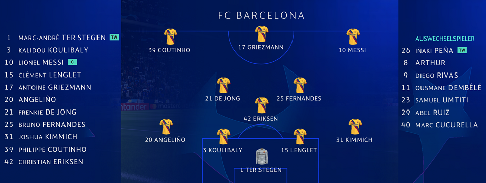 Von Eriksen kommt der Ball zu Kimmich der ihn nach Vorne zu Messi spielt.